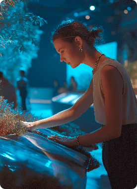 A Realidade Mista combina elementos da AR (Realidade Aumentada) e da VR (Realidade Virtual), criando experiências onde o digital interage em tempo real com o ambiente físico. É ideal para ativações de alta tecnologia, estandes inteligentes e experiências imersivas para surpreender o público.